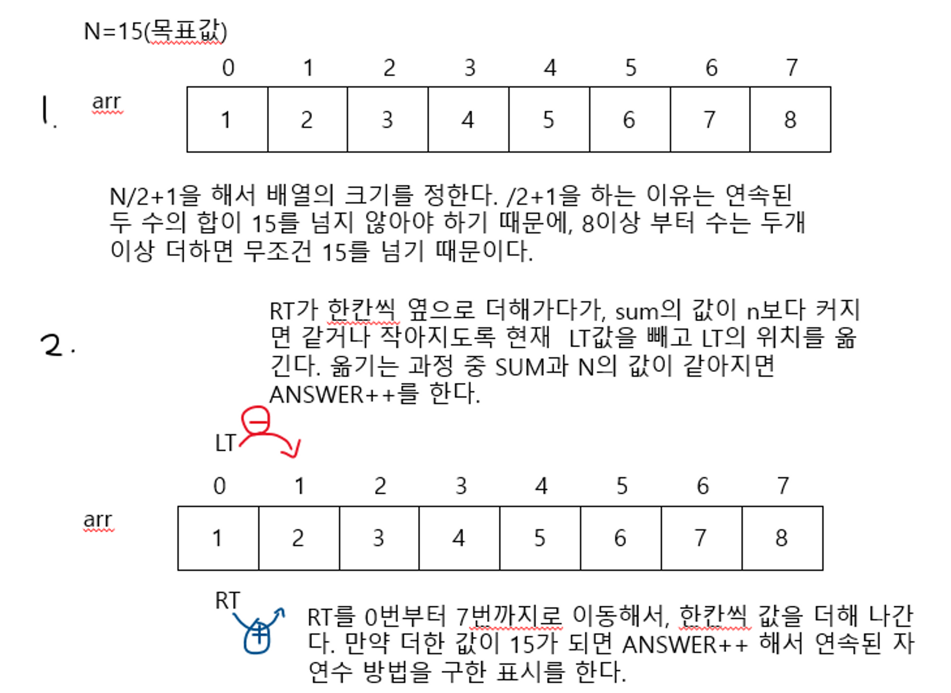 먼저 배열의 시작 부분 lt와 끝 부분 rt를 정한다. sum은 lt와 rt 안에 있는 배열의 합이다.