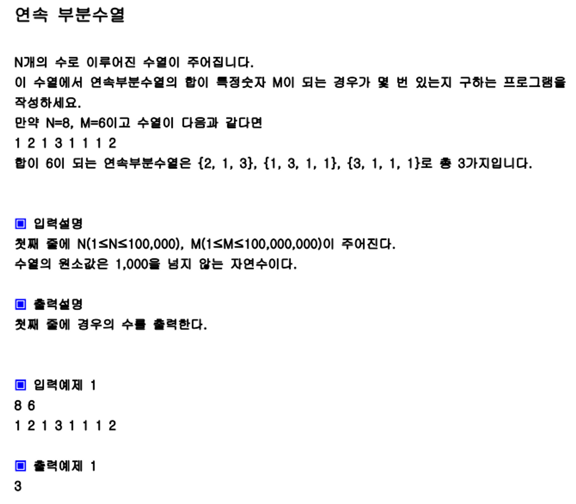 합이 목표값(m,6)보다 같거나 작으면 rt++해서 연속 부분수열 범위를 늘린 sum 값을 찾는다.