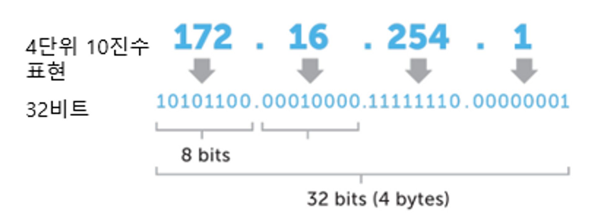 또는 8비트 단위로 점을 찍어 4개로 구분(8비트의 단위를 옥텟이라고도함) 8비트를 10진수로 표현한다.