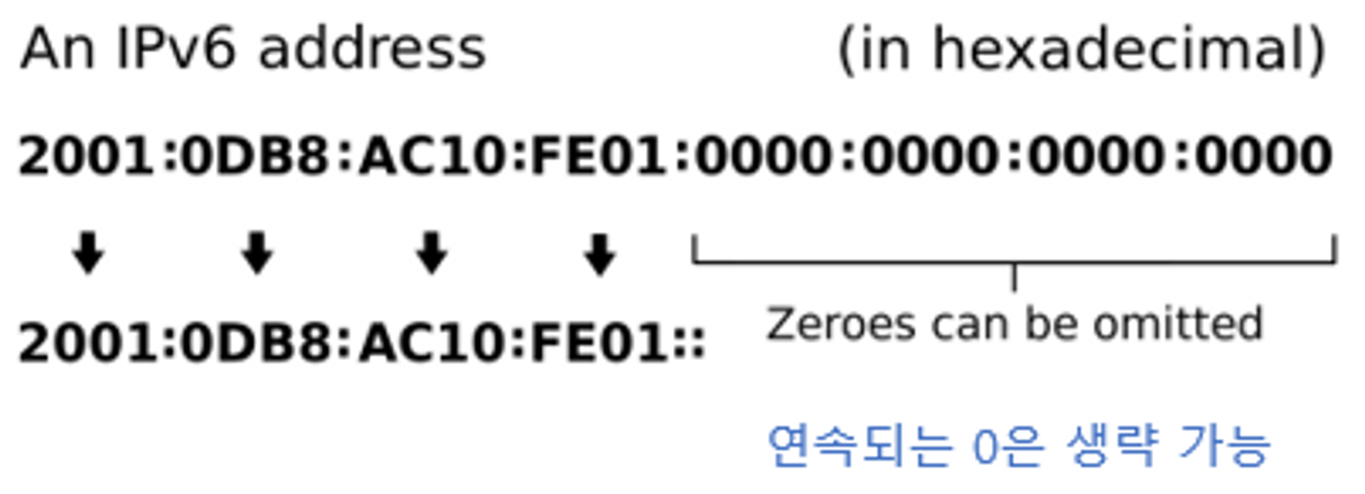 16비트씩 8개로 구분, 16비트는 16진수로 변환되어 콜론(:)으로 구분하여 표시하며 앞의 연속되는 0은 생략될 수 있다.