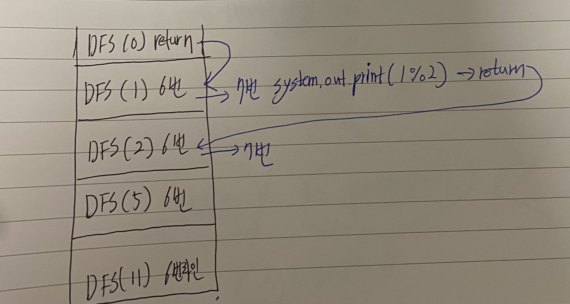 이런 식으로 DFS(11) 까지 System.out.print(n%2)가 실행해서 1011을 출력할 수 있게된다.