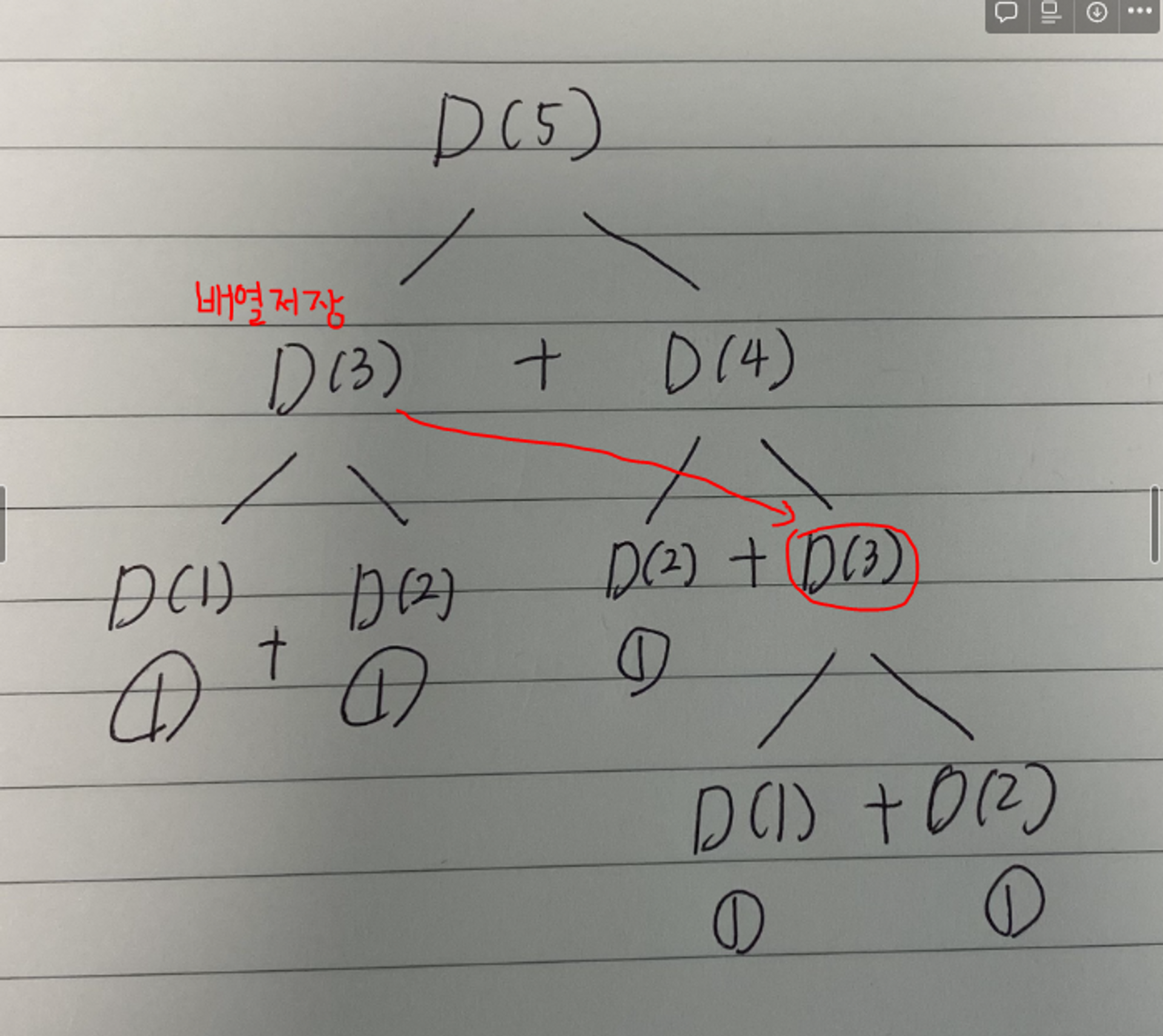 예를 들어 아래 그림에서 D(4) = D(2)+D(3)을 구할 때 이미 왼쪽에서 D(3)이라는 값을 구했기 때문에, 아래로 타고 내려가는 재귀를 거치지 않아도 된다.