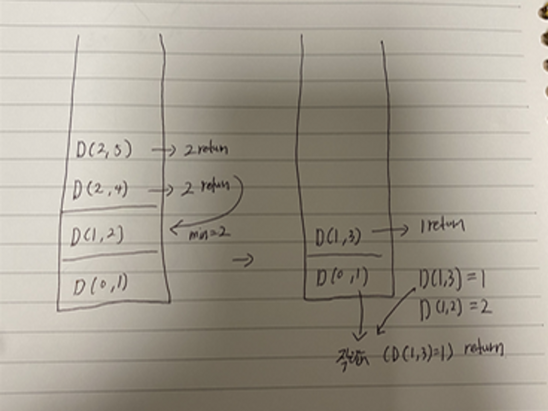 마지막에, D(0,root) 는 D(1,2)=2 값과 D(1,3)=1 값 중에서 더 작은 값을 선택 하게 된다.
