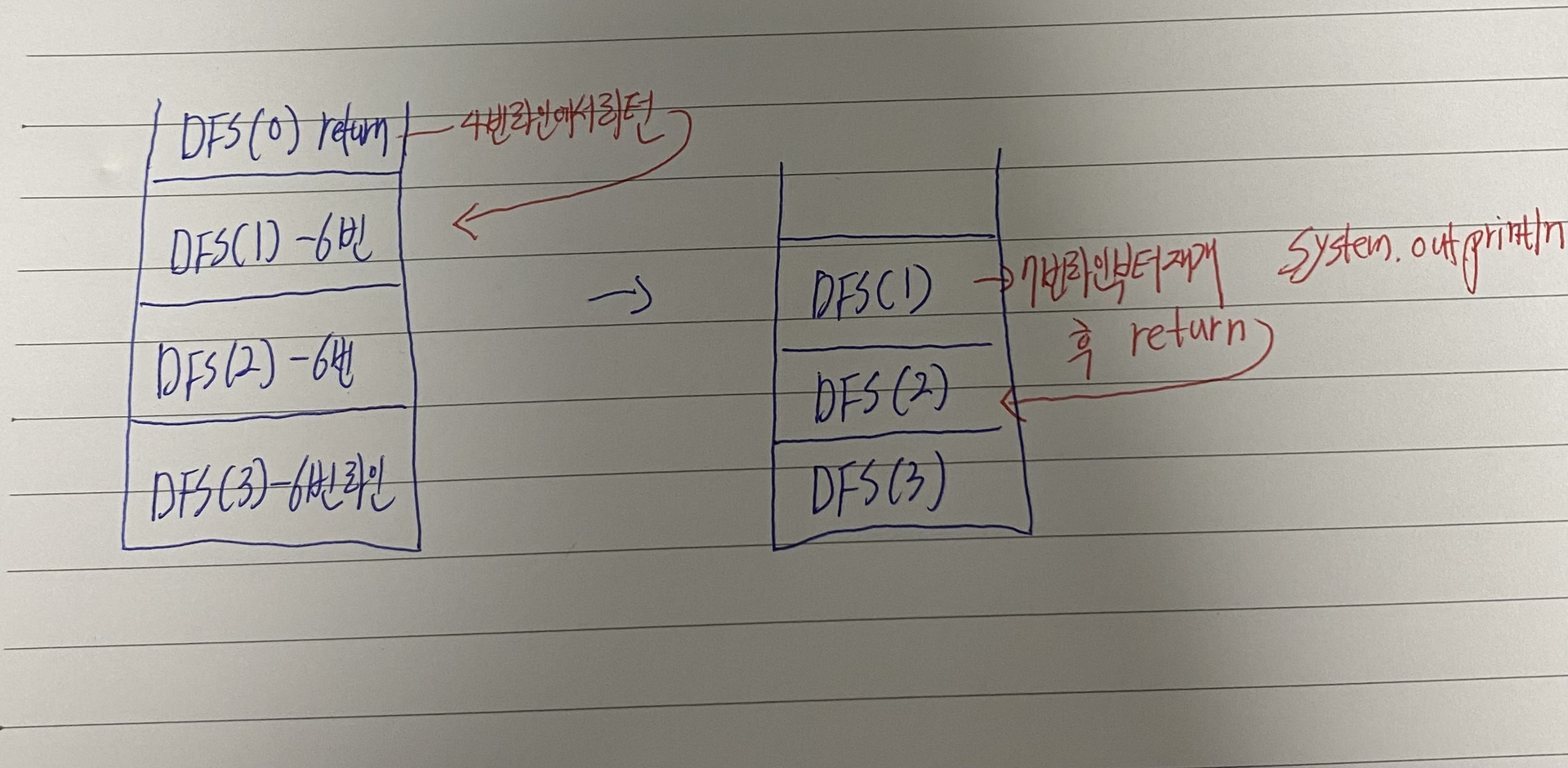 DFS(3) 에서 6번 라인에 DFS(n-1) 때문에, DFS(3)은 7번 라인이 실행 되길 기다리면서 스택에 쌓인다. 이런 방식으로 DFS(0)까지 쌓이게 되고,