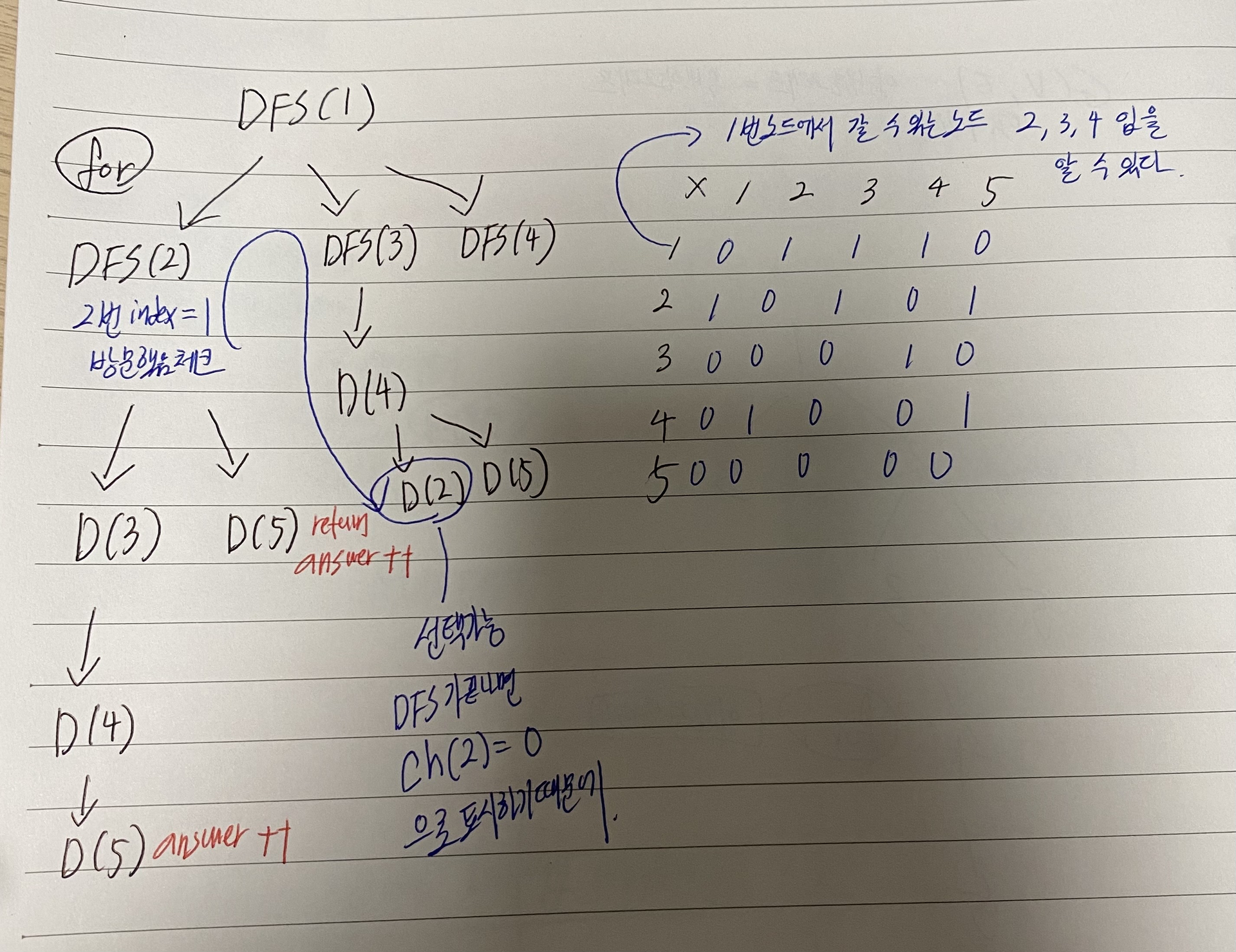 graph[1] (1과 연결된 노드)로 DFS() 재귀 함수를 호출한다. 그리고 ch[1] =1 로 변경해서, 노드 1로부터 뻗어 나간, 노드 DFS()들은 1을 다시 거치지 않게 설정한다.