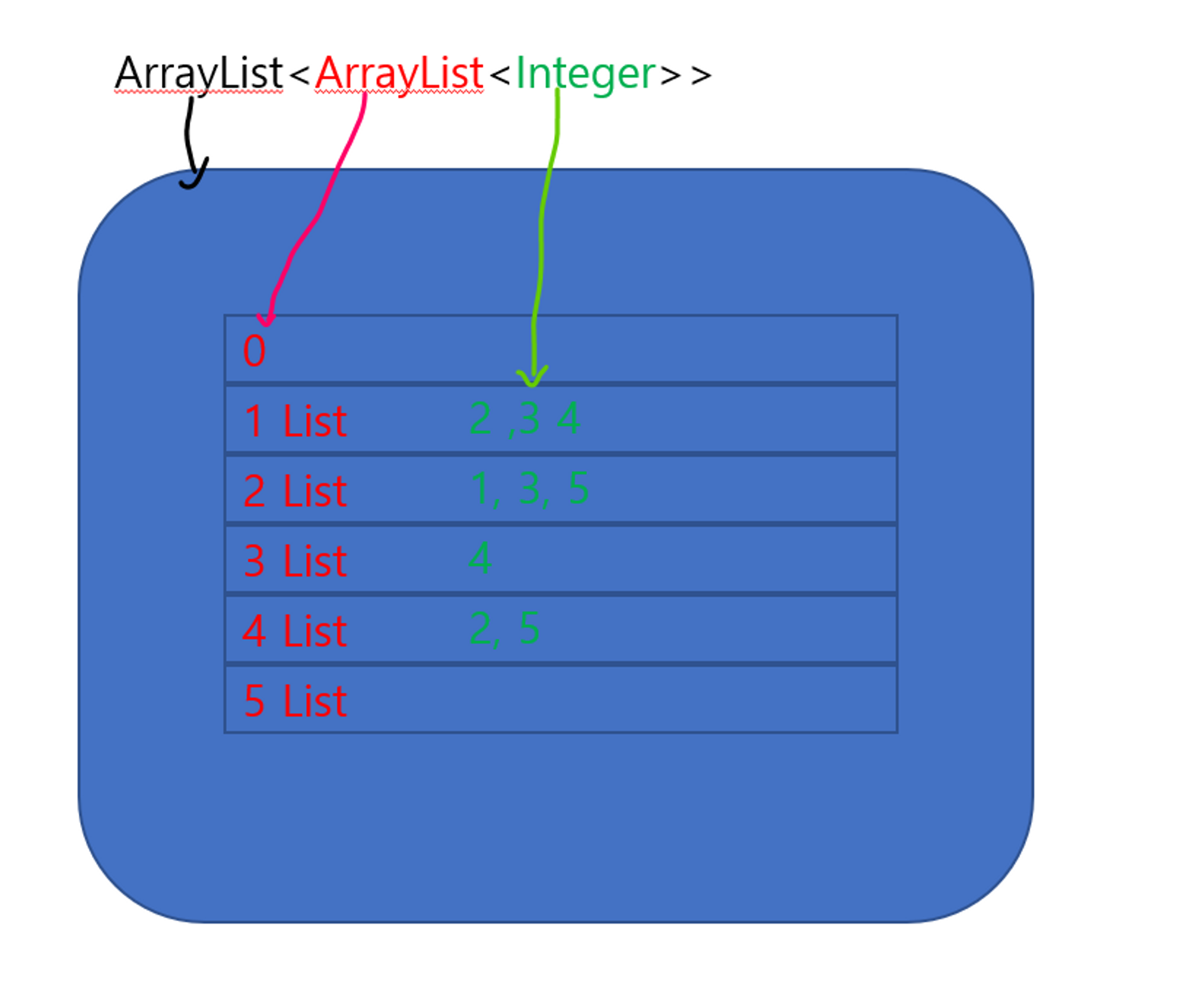 인접 리스트 인덱스 리스트가 노드가 되고, 인덱스 리스트 안에 있는 Integer들이 노드에서 갈 수 있는 접점들이다.