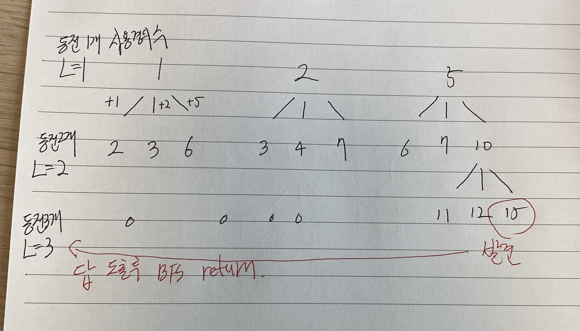 반면에, BFS는 L=1인경우 동전을 하나 사용했을 경우 합을 구한 후에 답이 없다면, L=2 동전 두개 사용한 경우 합을 구하는 방식으로 메소드가 진행된다. 그래서 동전을 3개 사용했을 때, 5+5+5를 구하는 경우의 수를 빠르게 찾을 수 있다.