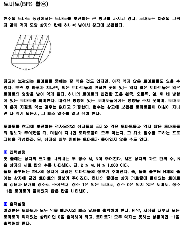 //Q가 다 빌 때가지 실행하면, Q가 끝나고도 board 토마토 상자 안에 0이 존재하면 영원히 익지 않는 경우다