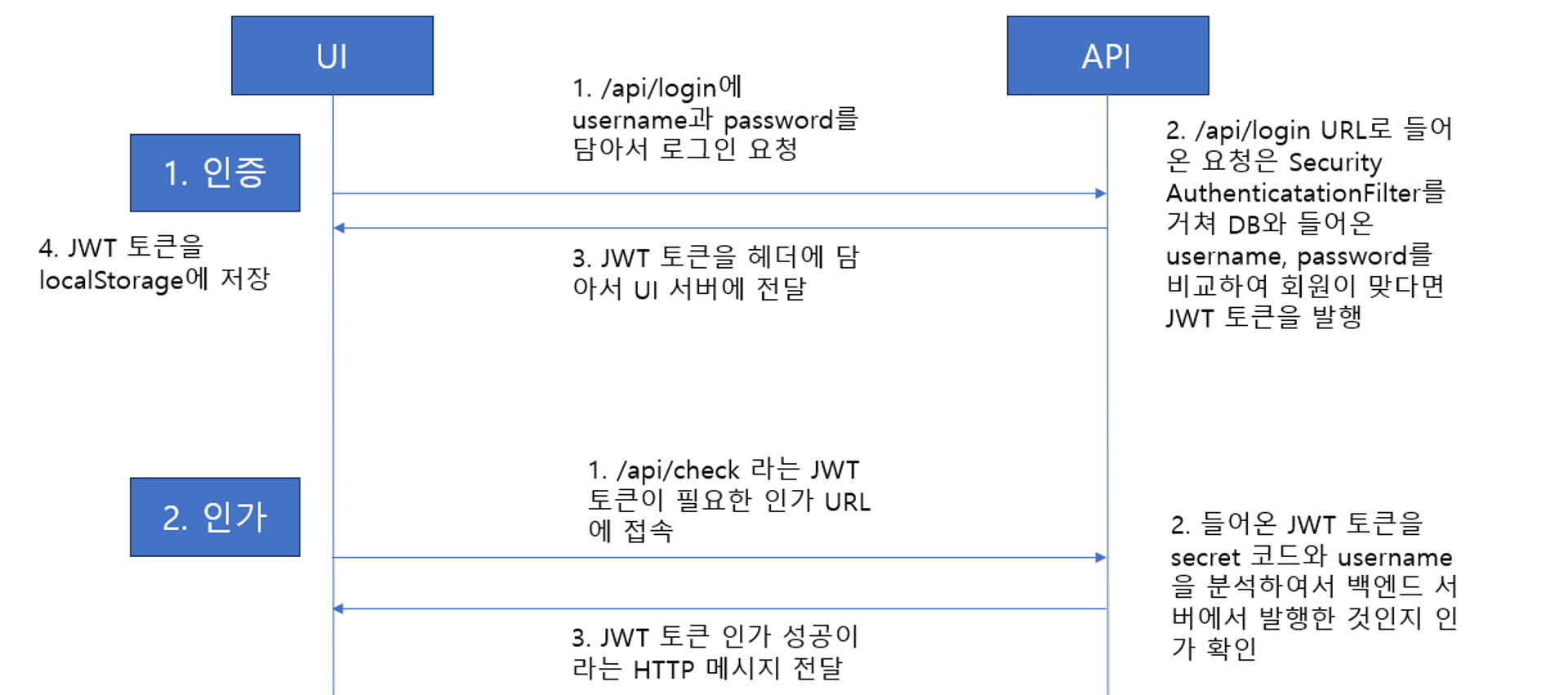 JWT 토큰을 local storage에 저장한 후에 해당 JWT 토큰을 가지고 기존 Security 인가 서비스를 이용할 수 있다.