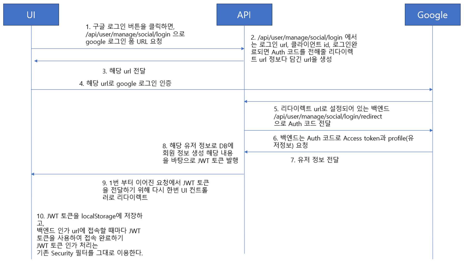 하나의 요청 프로세스로 구글 로그인 → JWT 토큰 전달까지 해야 하기 때문에 두 번의 redirect가 필요하다. 좀 더 자세한 프론트 - 백엔드 (OAuth 인증) 흐름은 아래 블로그를 참고하면 좋다.