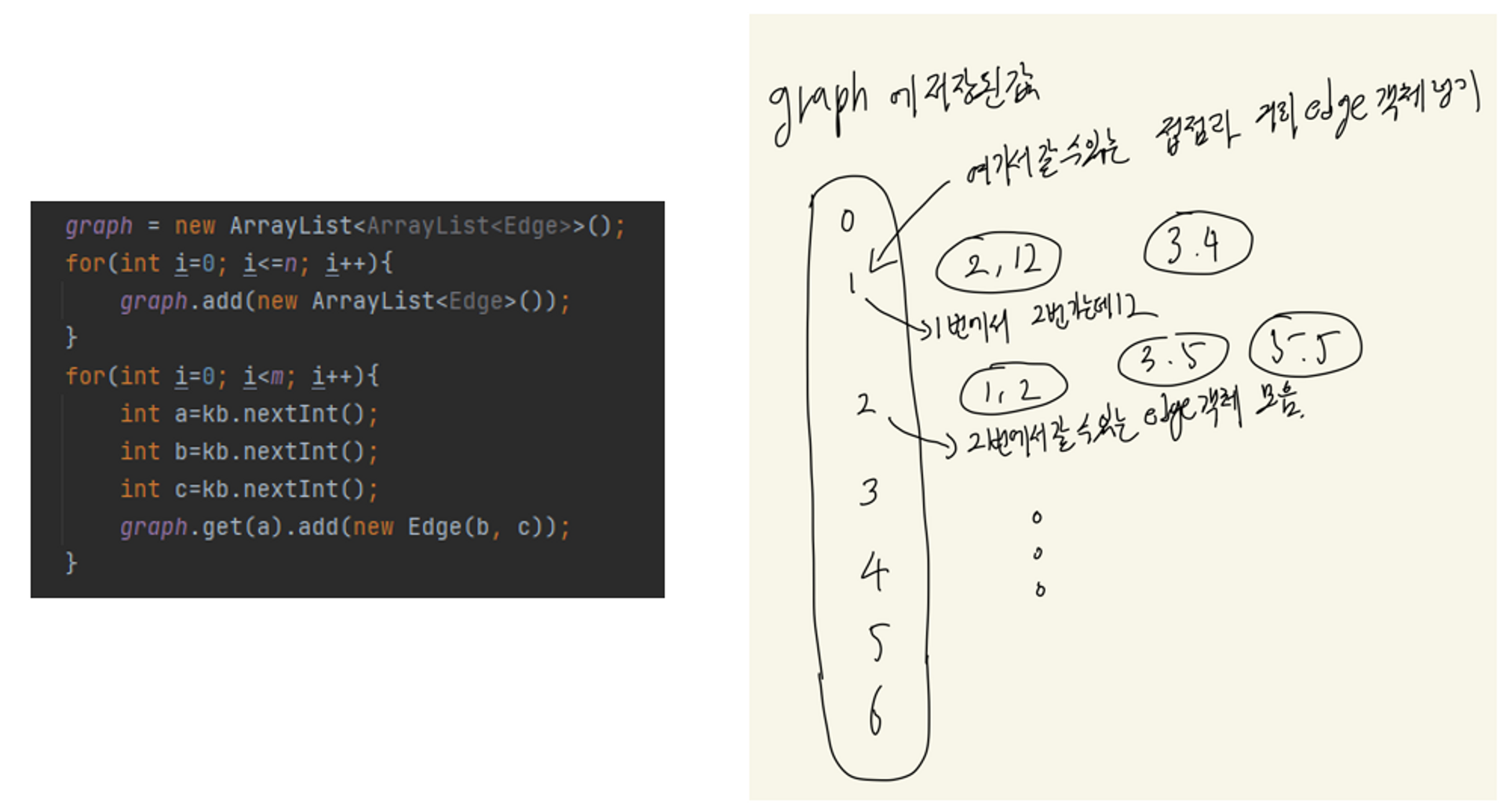 어레이 리스트에 인덱스(해당 점)과 연결되어 있는, 나아갈 점과 가중치가 들어 있는 edge 객체를 리스트로 등록하자. 위 그래프를 ArrayList<ArrayList<Integer>>로 표현하면 아래와 같다.