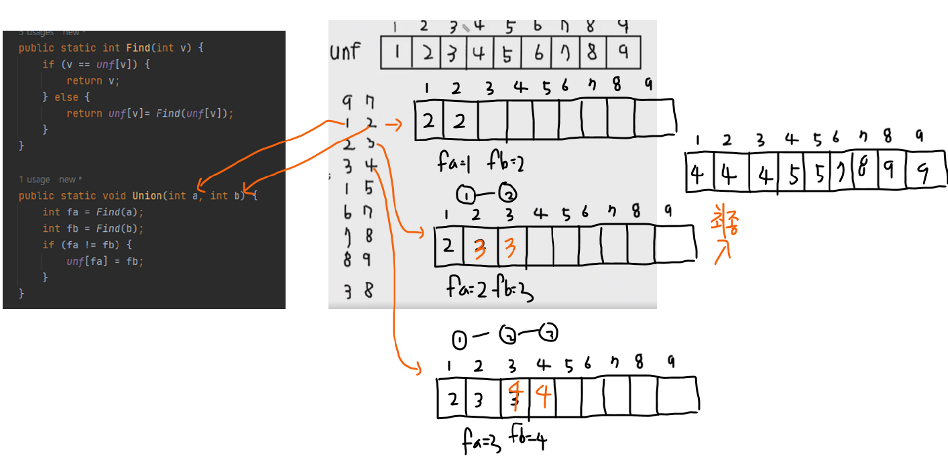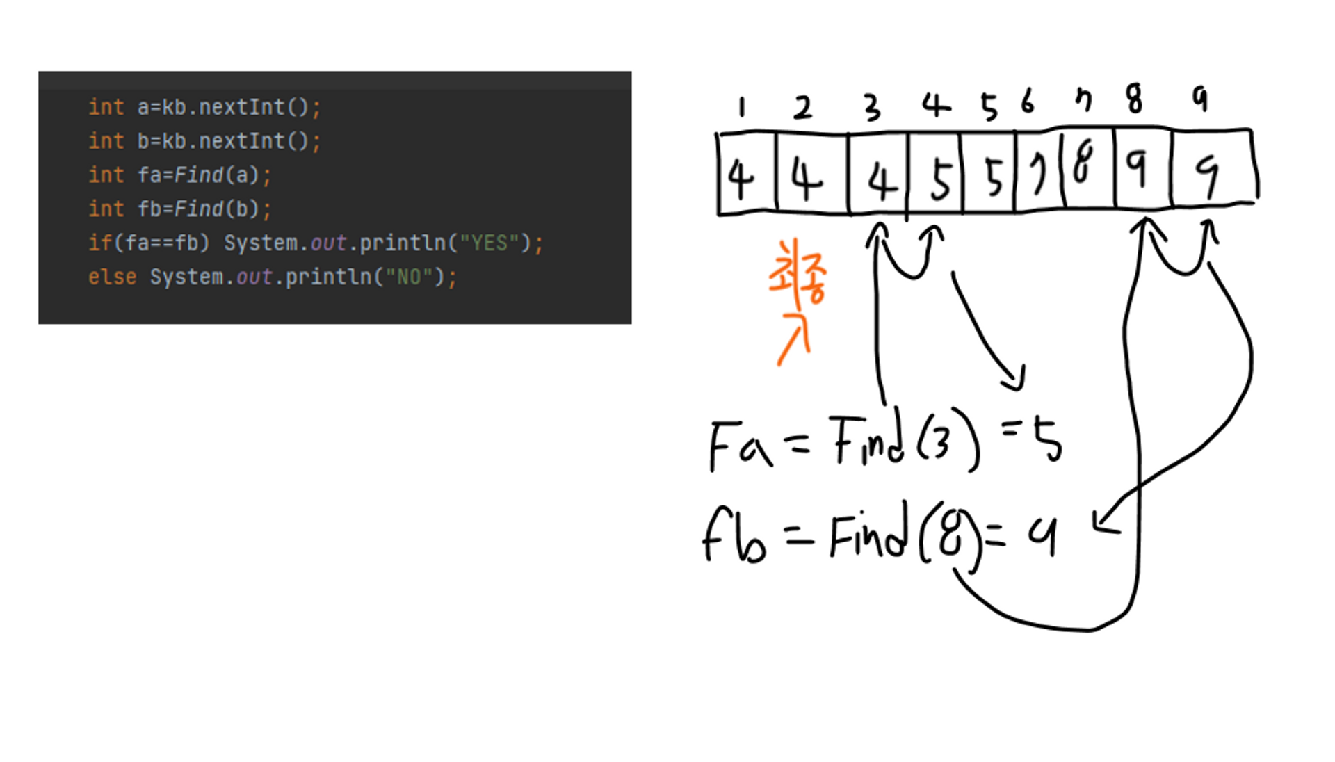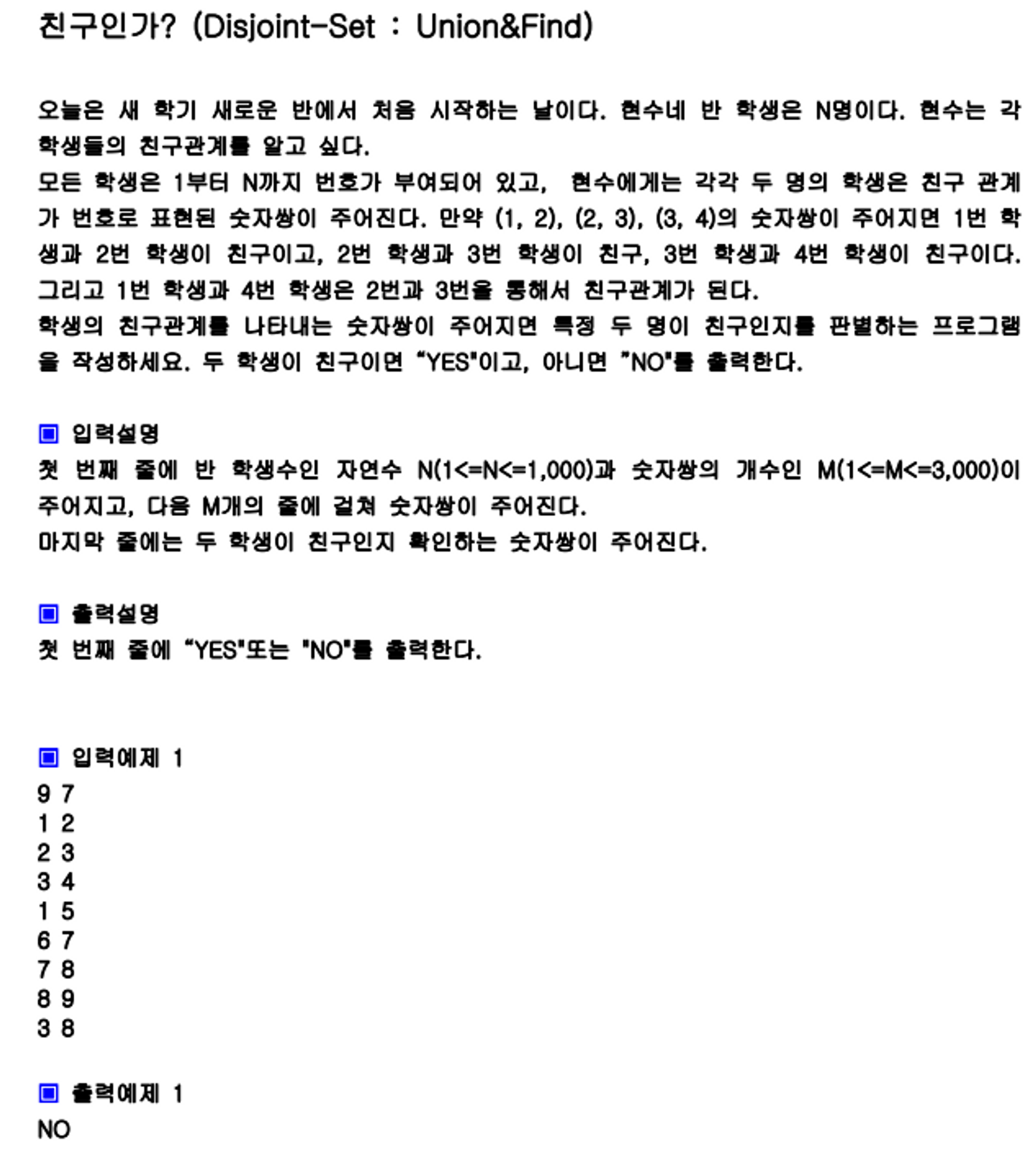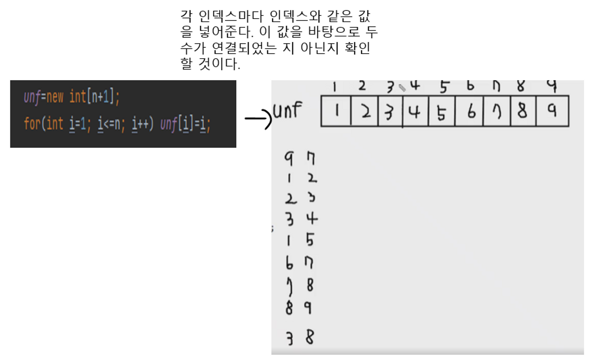 //연결 되었는 지 확인 할 수 있는 유니온파인드 배열 인덱스별값이 같으면 연결된 것이다.