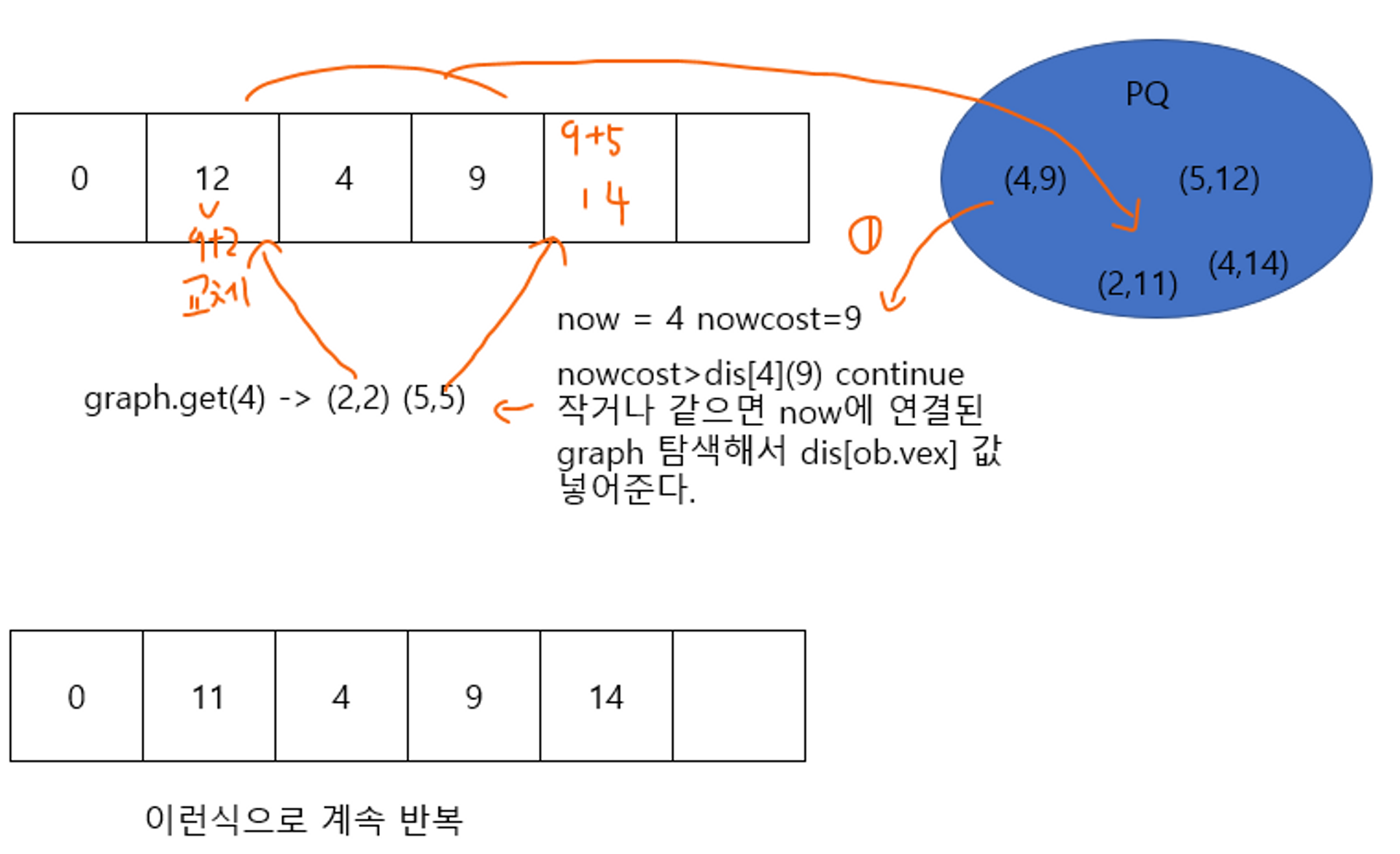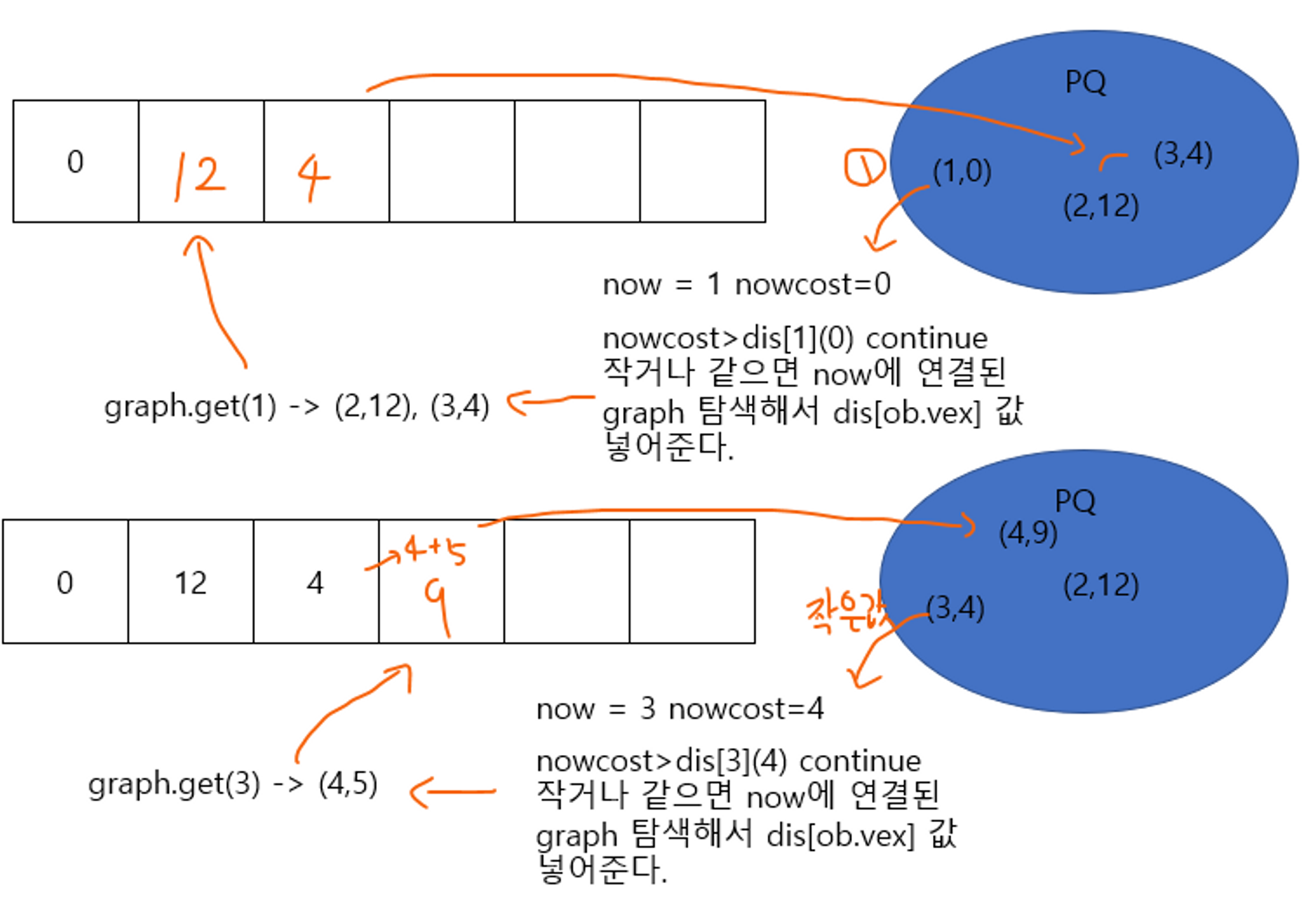 //1번 연결된 점들을 우선순위 큐에 다시 넣고 반복한다.
