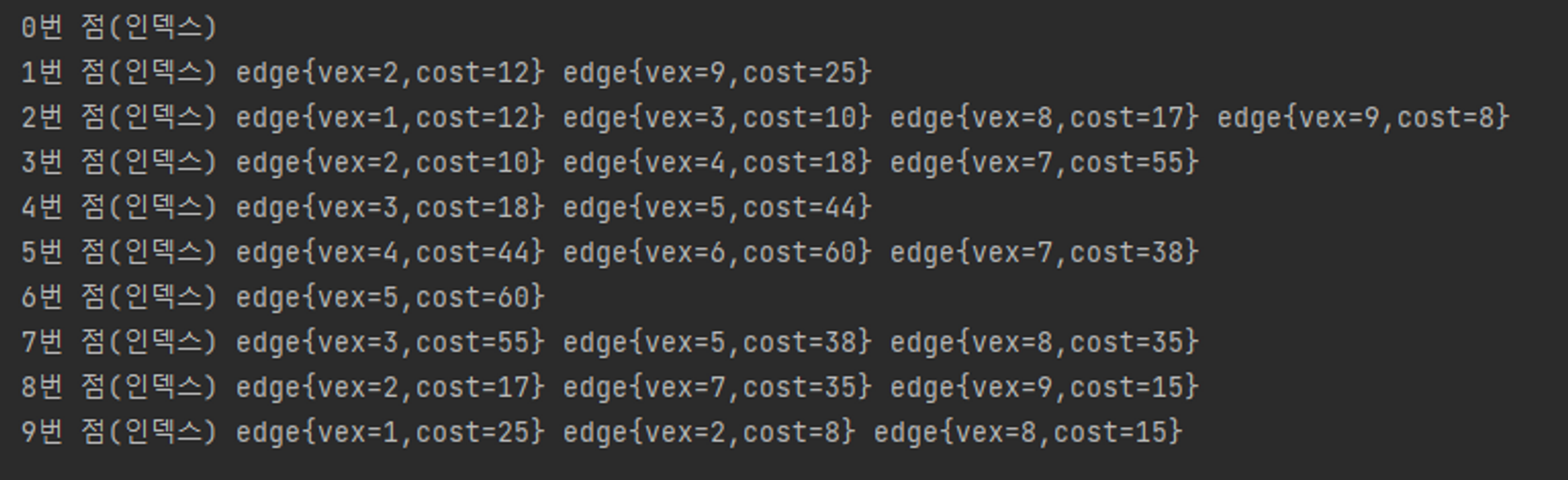 이제 PriorityQue를 사용해 cost가 적은 연결 점(edge)를 찾아내서, 이미 지나간 곳인지 확인하고, 지나가지 않은 곳이라면 answer에 값을 추가하고 그 점과 연결된 값들을 우선 순위 큐에 넣어서 반복한다.