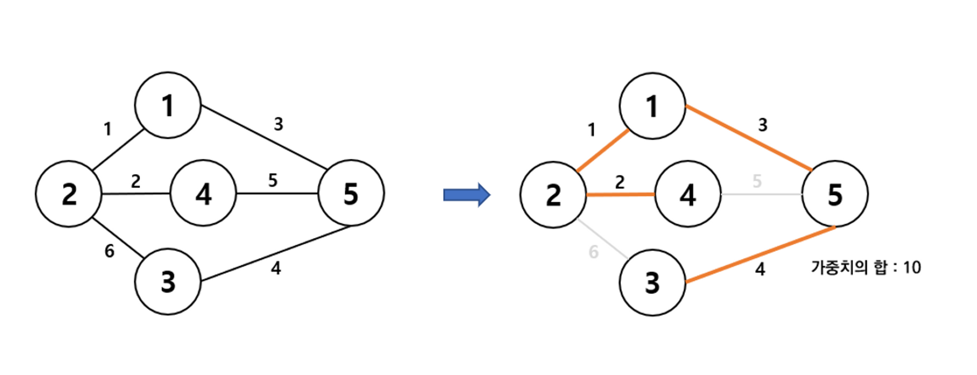 최소 신장 트리는 그래프에서 (1) 모든 정점을 포함하고, (2) 정점 간 서로 연결이 되며 싸이클이 존재하지 않는(tree의 기본 조건) 그래프를 의미한다.