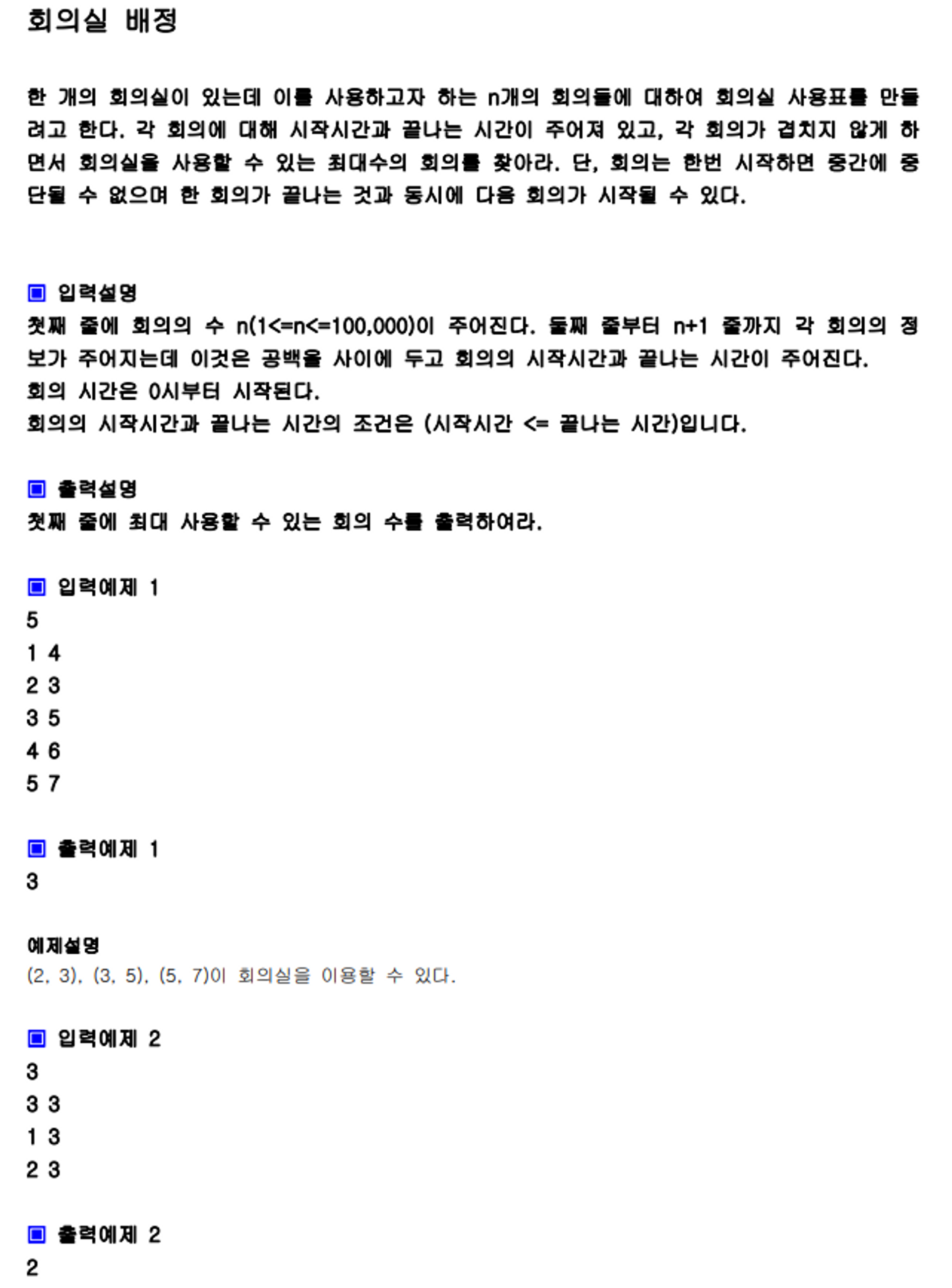 그 뒤에 오는 회의 시작 시간이 저장해 놓은 회의 끝나는 시간보다 같거나 크면 cnt++ 회의 가능 수를 추가하고, 해당 회의 끝나는 시간을 회의실 끝나느 시간으로 다시 저장해 놓는다.