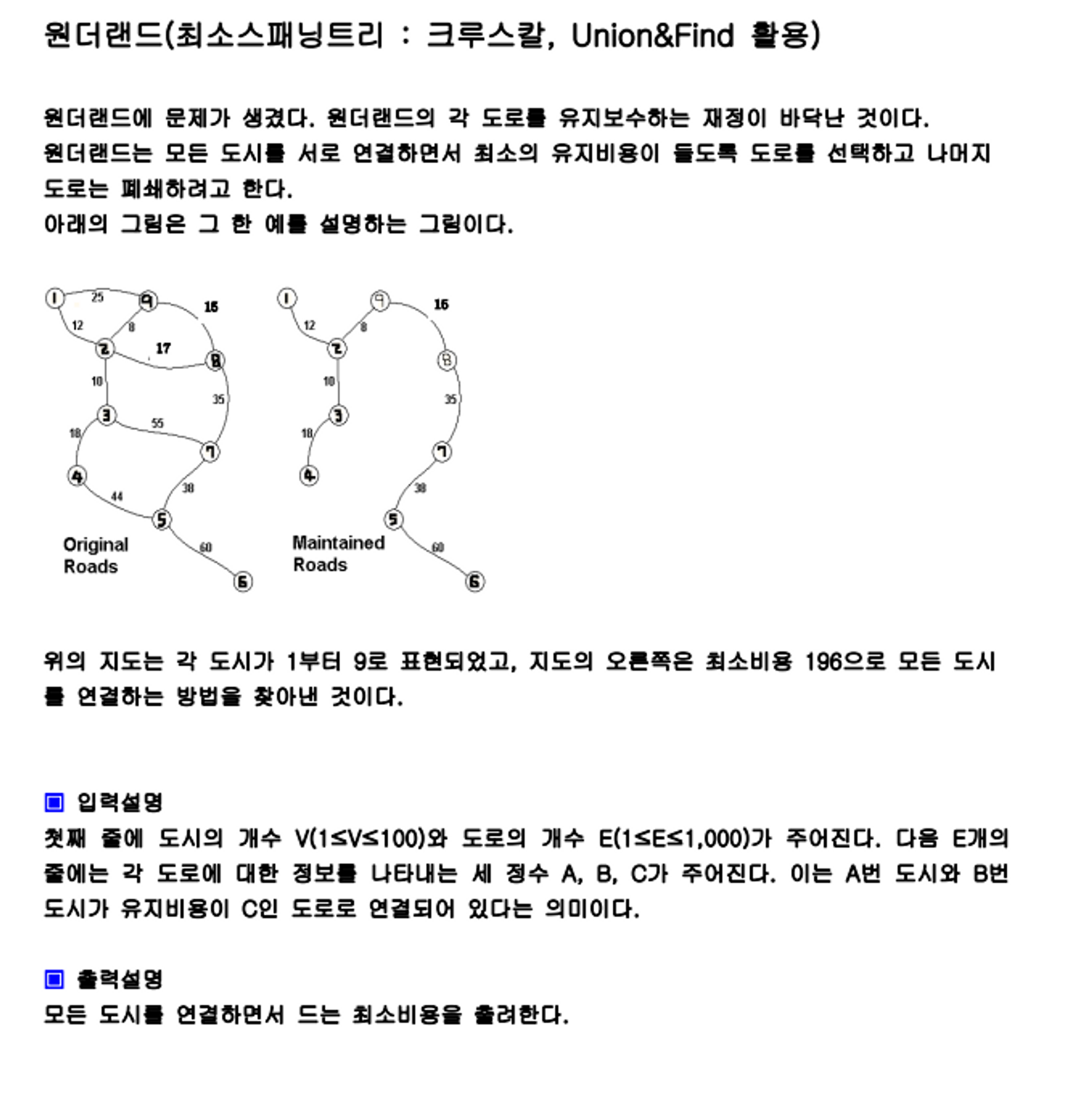 원더랜드(크루스칼 알고리즘(최소신장 트리 구하기) Union&Find 활용)