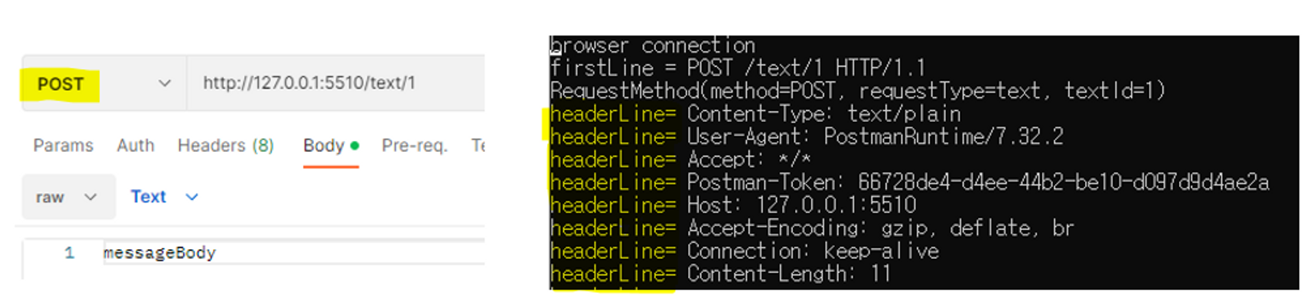 해당 서버에서는 POST Method - message body로 들어오는 text에 저장할 데이터를 받기 위해 Request Header 정보가 반드시 필요하다. Header에 message body로 들어오는 데이터 길이가 입력되어 있기 때문에 해당 정보를 받아서 MessageBody 획득에 사용한다.
