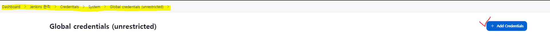 먼저 dockerhub의 로그인 정보를 저장할 credential을 설정한다. Dashboard → Jenkins 관리 → Credentials → Global credential 위치로 들어가 Add Credential 버튼을 클릭한다.