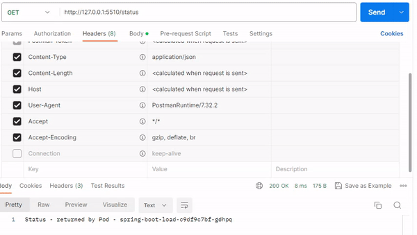 org.springframework.core.env.Environment을 빈으로 등록하여 요청이 들어오면 각 레플리카 서버의 hostname을 출력할 수 있도록 method를 만든다. kubernetes의 loadbalance기능이 잘 작동한다면 /status 요청마다 다른 response 정보를 얻게 된다.