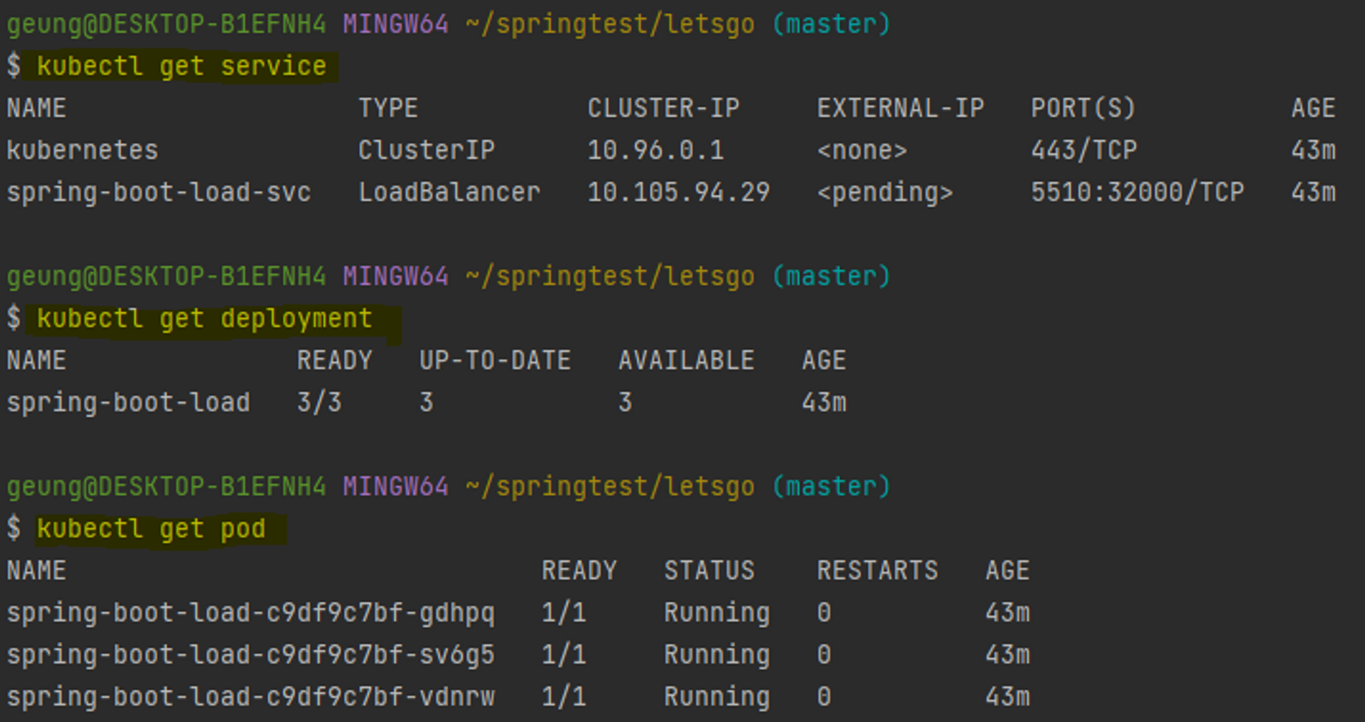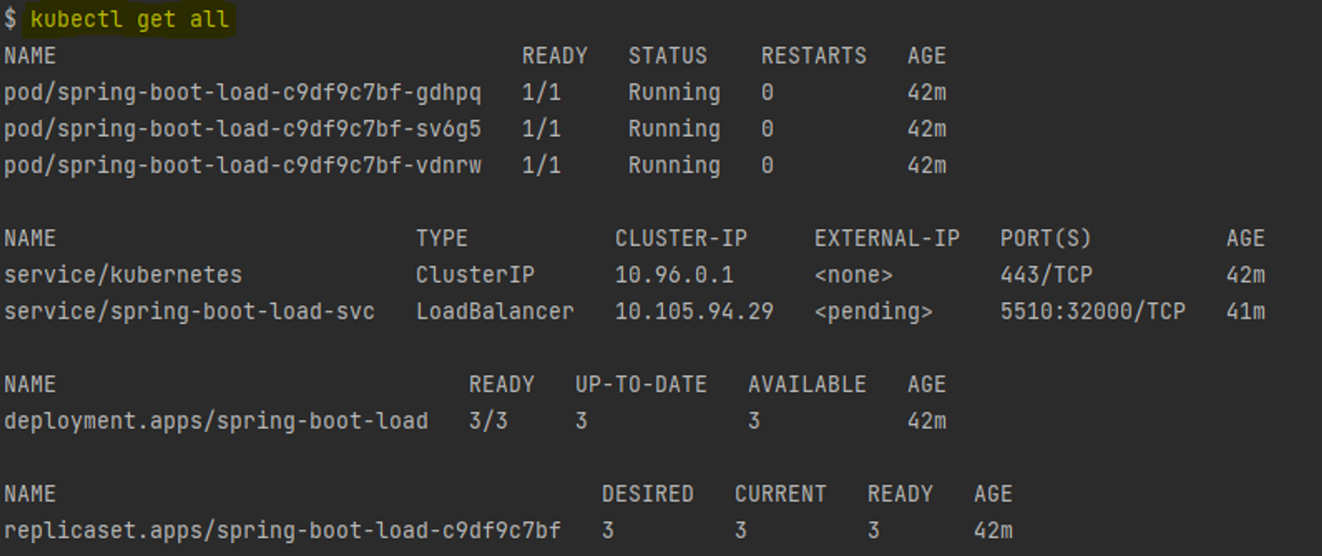 - get service, pod, deployment로 개별 적 확인이 가능하다.