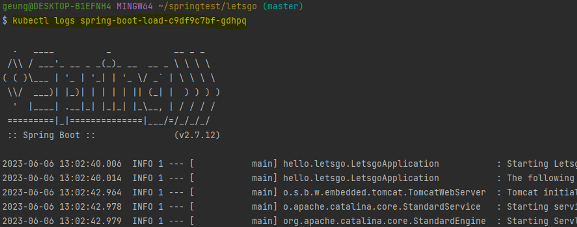 - kubeclt logs [pod name] 으로 실행 중인 spring boot application log를 확인할 수 있다.
