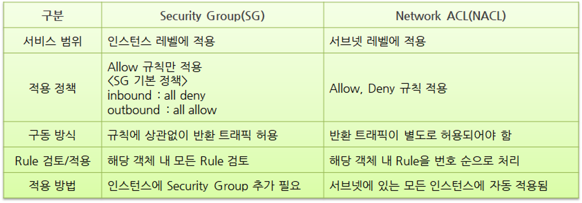 보안 그룹은 서브넷과 리소스에서 설정할 수 있고, 비슷한 역할을 하는 네트워크 ACL은 서브넷 단위에서만 적용할 수 있다.