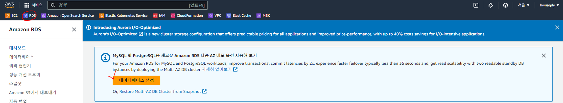 - AWS RDS 생성 페이지에 들어간다.