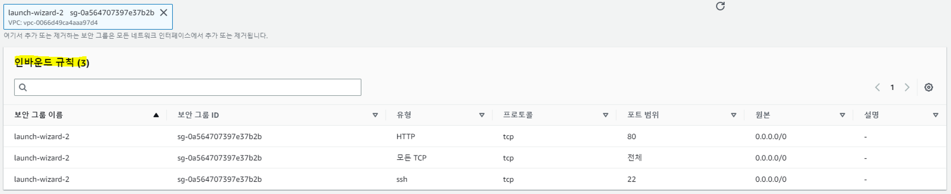 - 보안 그룹은 모든 트래픽이 들어올 수 있게 설정한다.