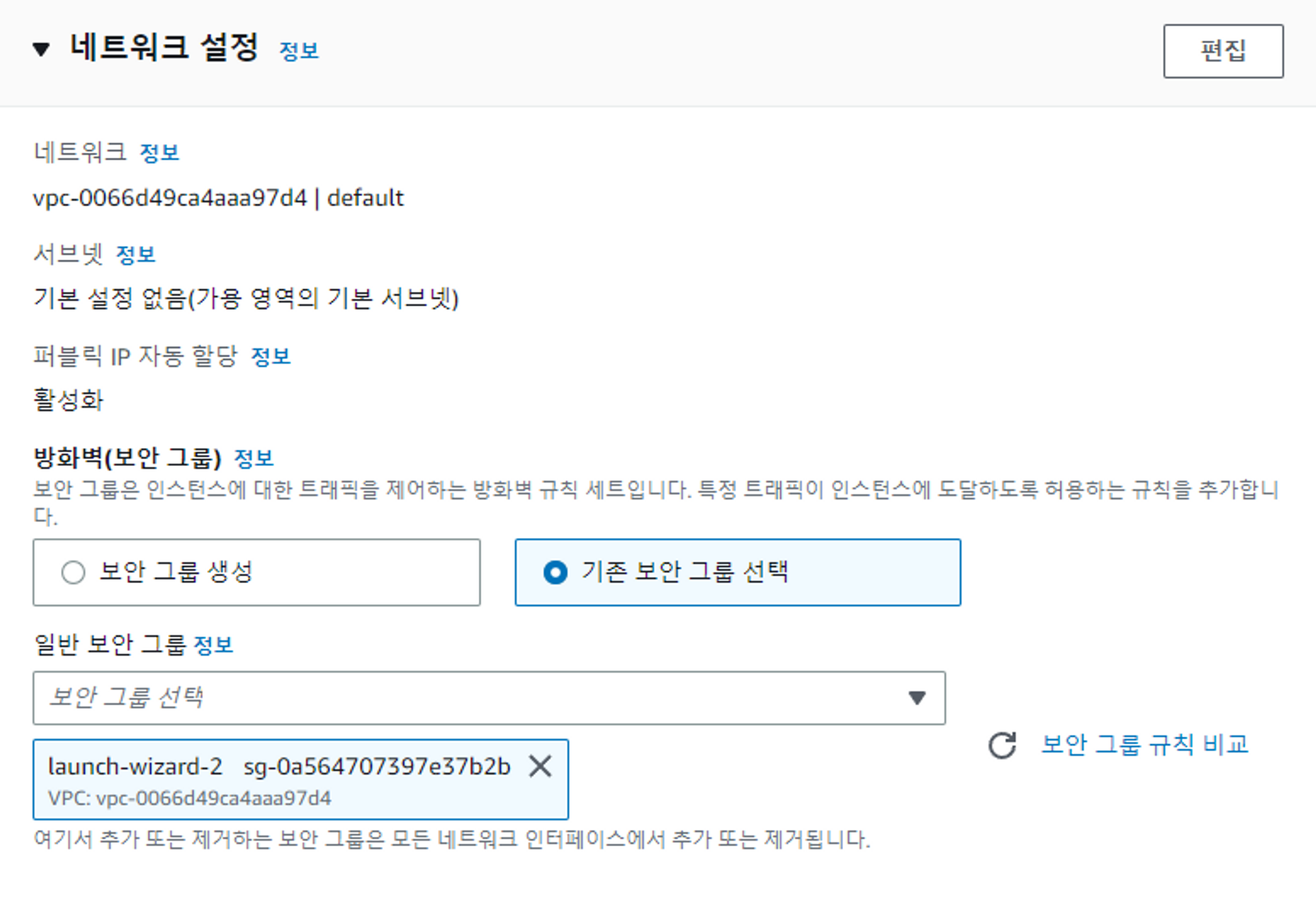 - VPC를 aws 계정 생성 시 자동으로 생성해주는 default VPC로 설정하고 EC2 인스턴스를 생성한다.
