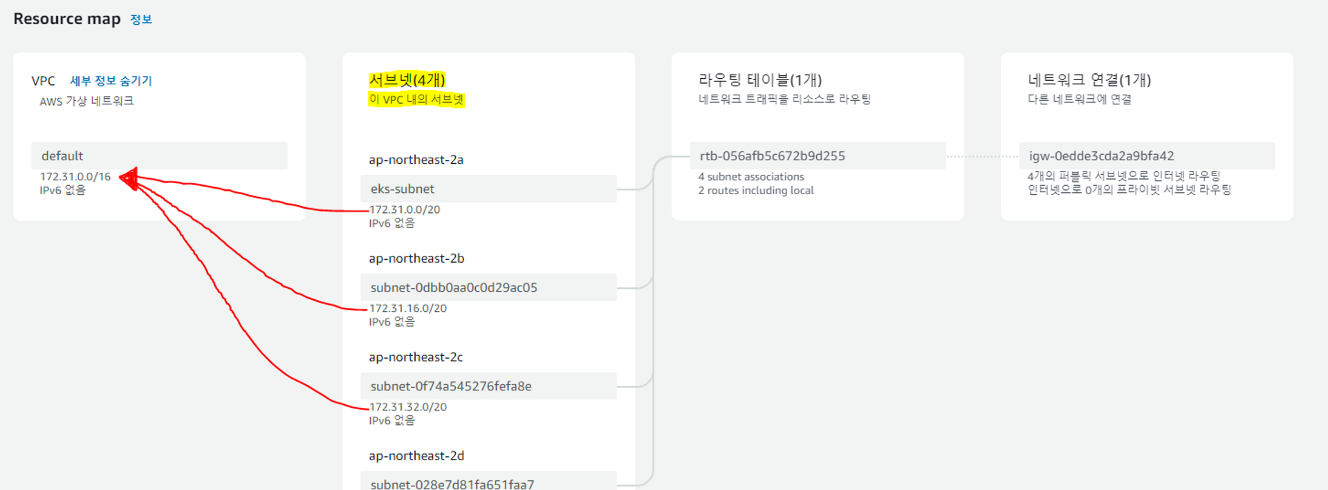 위 그림 예시는 AWS 계정을 만들면 자동으로 생성해주는 VPC와 Subnet 그룹이다. 4개의 Subnet IPv4 CIDR 값이 VPC의 IPv4 CIDR에 포함 된다는 것을 알 수 있다.