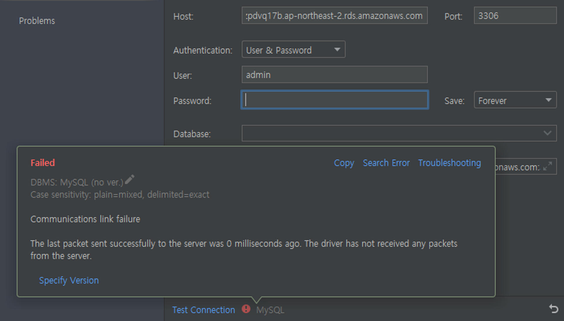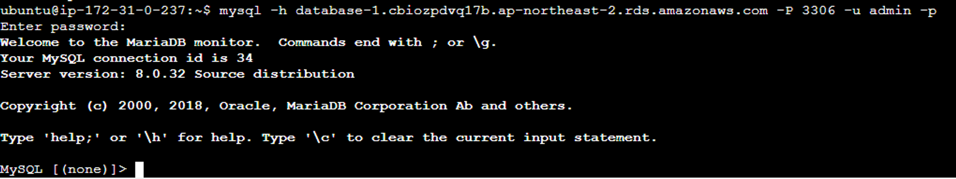 $ mysql -h database-1.cbiozpdvq17b.ap-northeast-2.rds.amazonaws.com -P 3306 -u admin -p