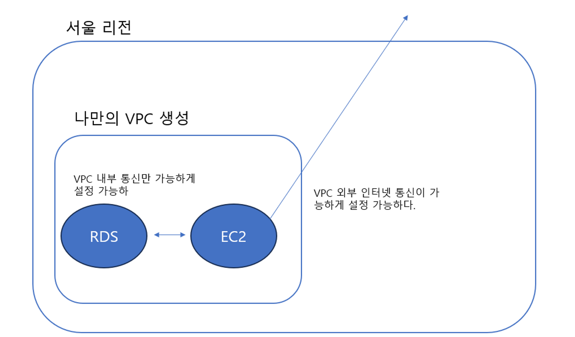 VPC는 Virtual Private Cloud의 약자로 각 리전에 격리된 개별 네트워크 환경을 구성해준다. 격리된 네트워크 환경에 AWS 서비스들을 배치하여 내 입맛대로 서비스 네트워크 통신을 설정할 수 있다. 예를 들어 외부(인터넷)으로부터 격리 보안이 필요한 RDS 서비스 같은 경우, Private Subnet에 두어 VPC 내부 통신만 허용하게 할 수 있고, 인터넷 노출이 필요한 웹 EC2 서버의 경우 public Subnet에 두어 인터넷 통신을 허용할 수 있다.