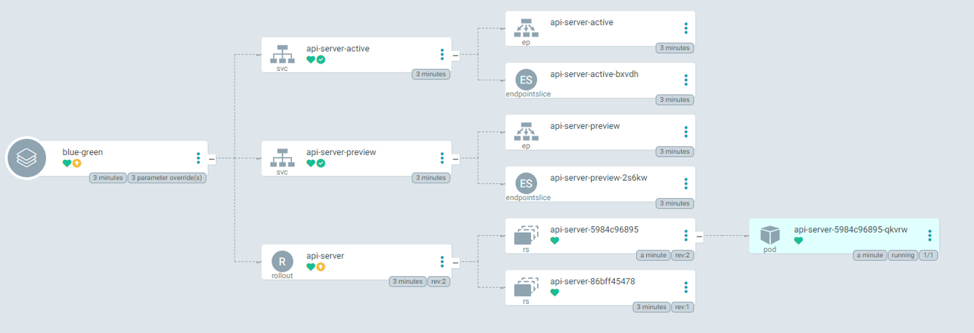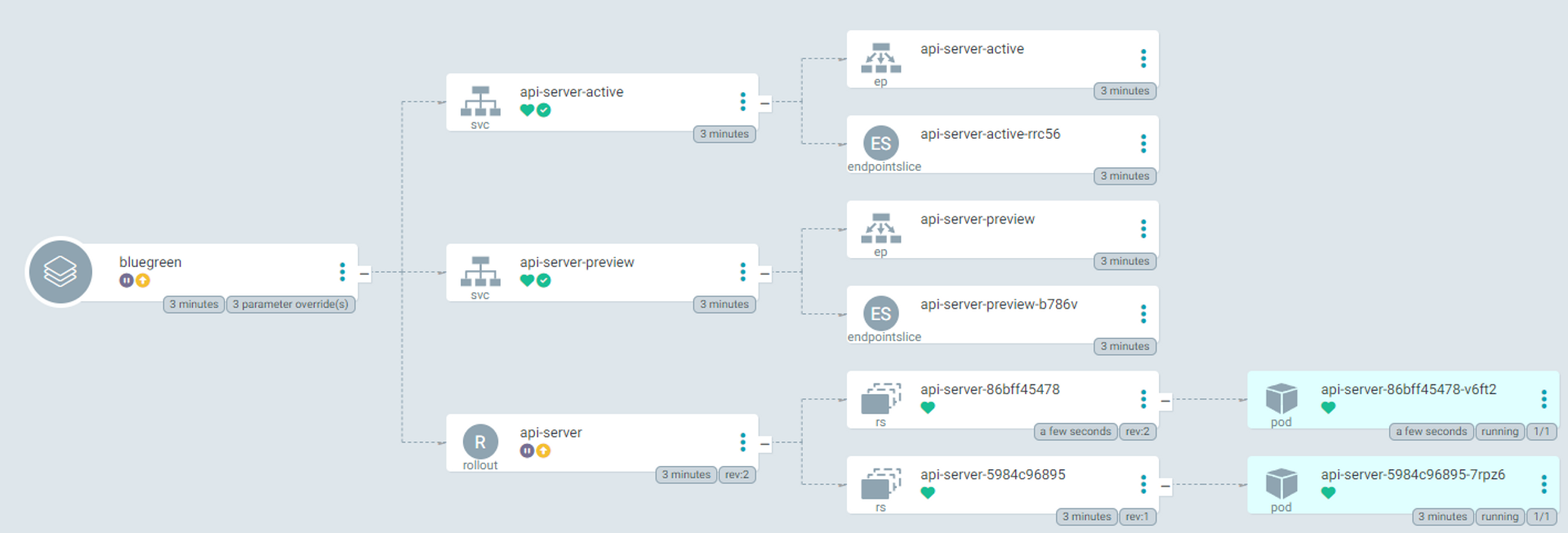 기존 Blue Pod은 active service 리소스에서 실행되고 있고, 업데이트할 Green Pod은 preview service 리소스에서 실행 준비를 맞힌다. Preview에서 실행 준비가 끝나면 기존 active service 리소스를 preview resource로 교체하면서 배포가 완료된다.