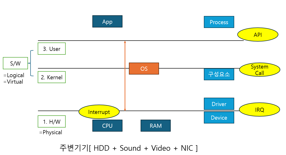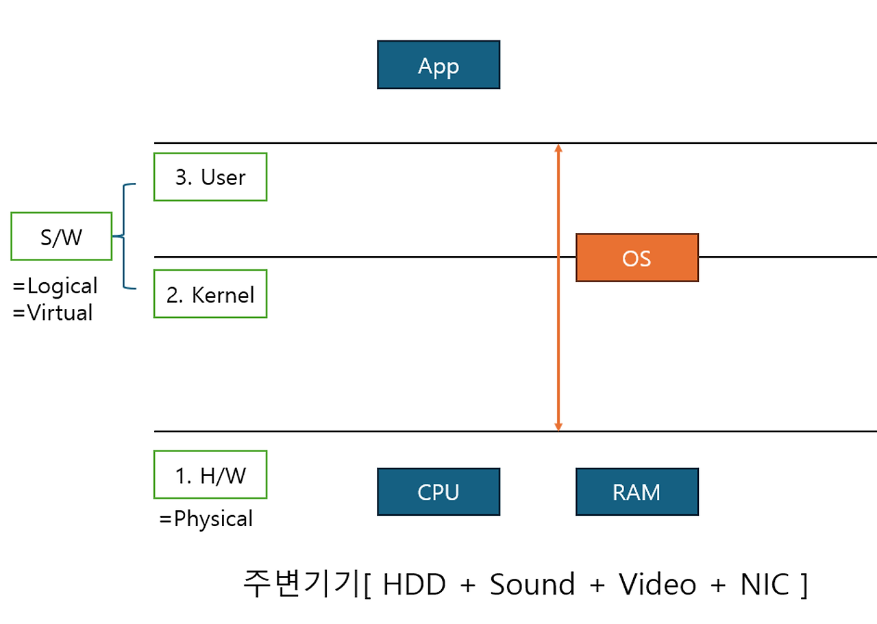 좀 더 자세하게 컴퓨터를 나눠보면 1.하드웨어, 2.커널, 3.유저 3개의 층으로 구성되어 있다.