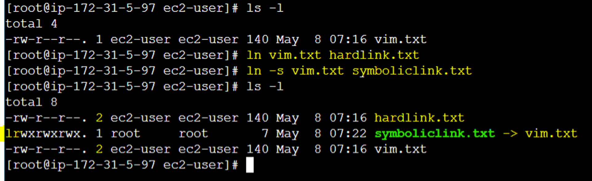 - 하드링크는 원본 파일을 복사하는 것과 유사한 작동, 다만, 한쪽을 수정하게 되면, 다른 쪽도 함께 수정된다. 원본 파일을 삭제하는 경우, 하드링크는 inode를 통하여 원본파일이 저장된 주소로 데이터를 찾아내어 원본파일이 지원지지 않고 유지된다.