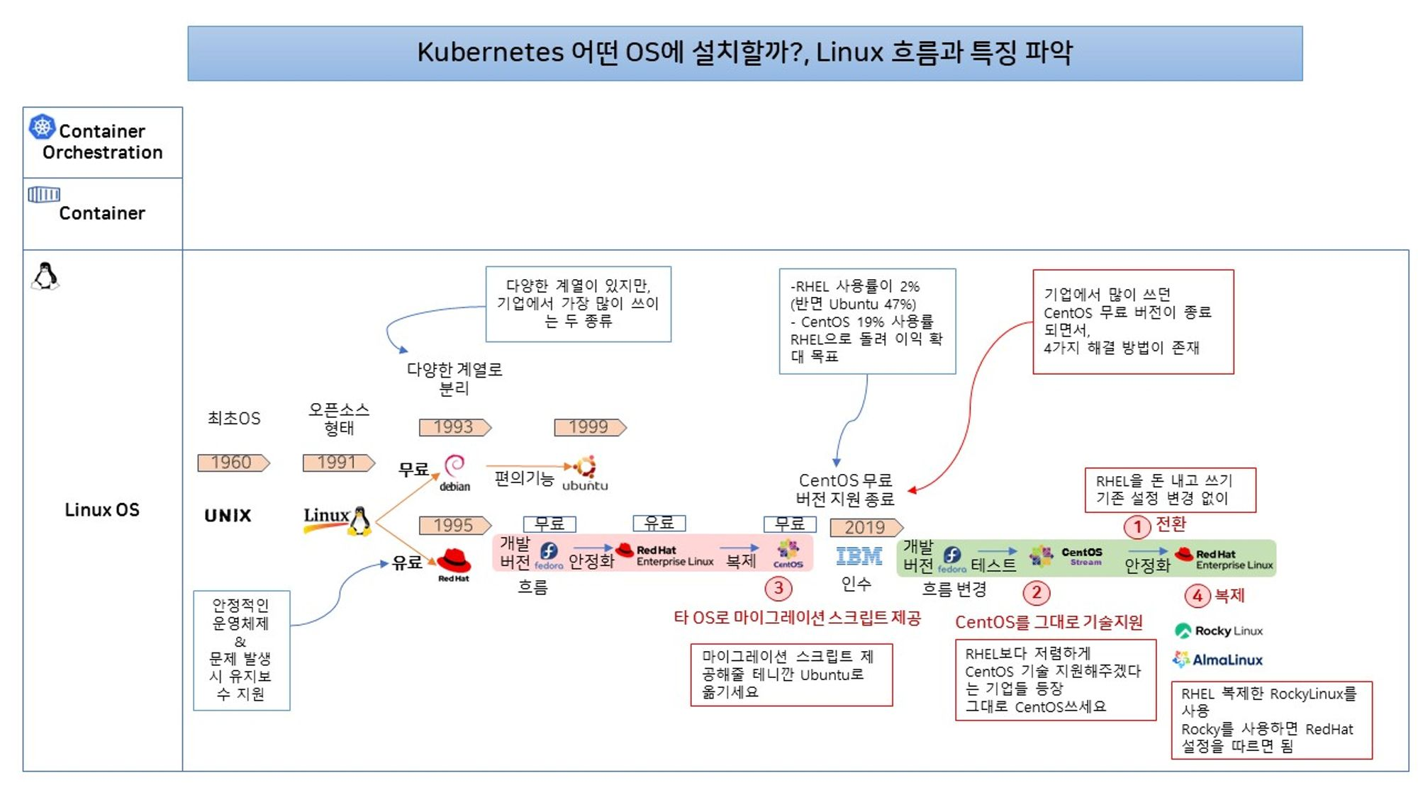 RedHat이 IBM 기업으로 인수 되면서, RHEL 사용율과 이익을 높이기 위한, 무료 CentOS 지원이 종료되었다. 변화된 상황에서 4가지 해결 방법이 존재한다.
