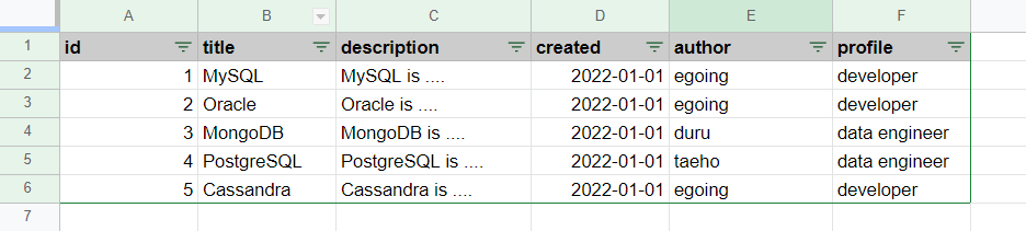 데이터 베이스인 스프레드 시트를 활용하면, 위의 데이터를 테이블 형식으로 나타낼 수 있다.