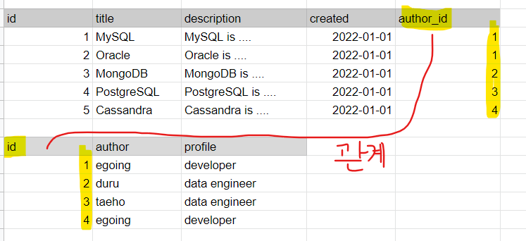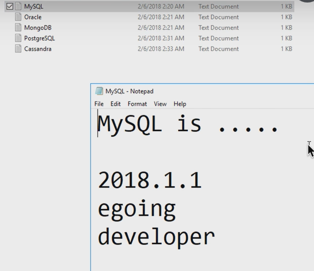 텍스트 파일을 통해서, 제목, 내용, 날짜, 저자, 저자 프로필을 파일로 관리한다면 문제점이 무엇이 있을까? 이렇게 파일 형식으로 한다면, egoing이라는 저자가 작성한 데이터를 찾으려면 모든 파일을 열어봐야 한다. 또한 저자 egoing이라는 저자의 프로필 developer를 수정하려면, 모든 파일을 열어서 일일이 수정해야 하는 어려움이 있다.