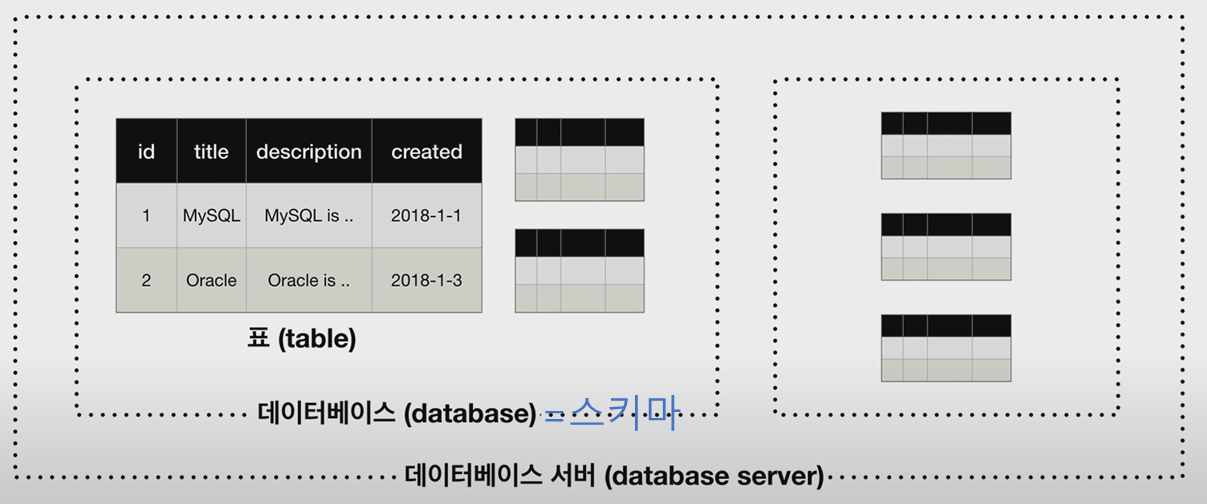 관계형 데이터베이스의 구조는 위 사진과 같다. 먼저 테이블은 한 주제에 대한 데이터의 집합을 의미한다. 위 예시로는 코멘트의 집합, 저자들의 집합과 같다. 이러한 테이블 중에서 관계성이 있는 것을 모아 놓은 폴더가 데이터베이스(=스키마)라고 한다.(기능이 적은 MySql에서만 데이터 베이스와 스키마를 같다고 본다. Oracle이나 ProgreSQL의 경우 여러개의 스키마를 데이터베이스를 가지는 구조이다.) 위 예시를 보면, author id라는 핵심 키를 통해서 관계되어 있는 author테이블 topic테이블 comment테이블을 저장하는 폴더를 데이터 베이스라고 할 수 있다. 마지막으로 다양한 데이터 베이스를 모두 저장하는 곳이 데이터베이스 서버이다.