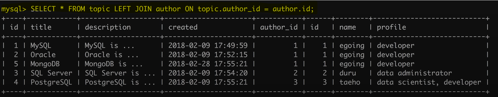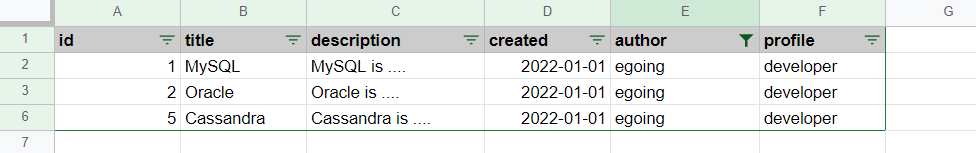 데이테 베이스 기능 중 하나인 READ를 사용해서, 저자가 egoing인 데이터들만 조회할 수 있다.