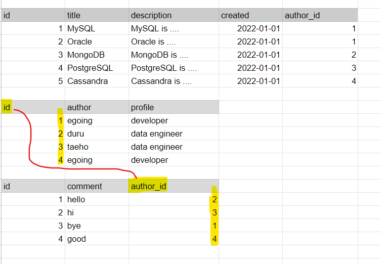 author를 핵심 키로 관계형 데이터베이스를 만들면, 핵심 키와 관련된 comment 테이블을 쉽게 만들 수 있다.
