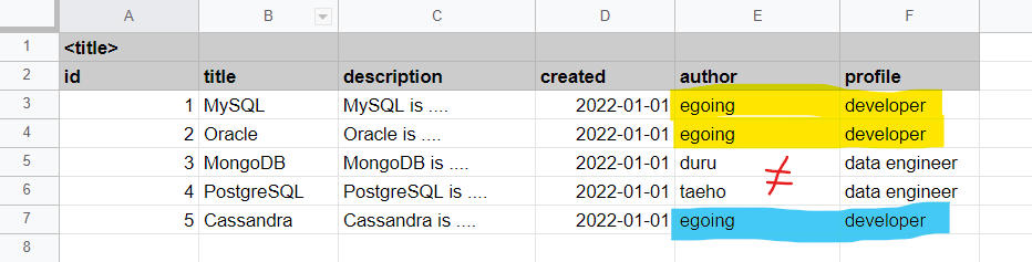 <1번 예시- id1,2번과 5번 author가 같은 egoing이 아니라면?>