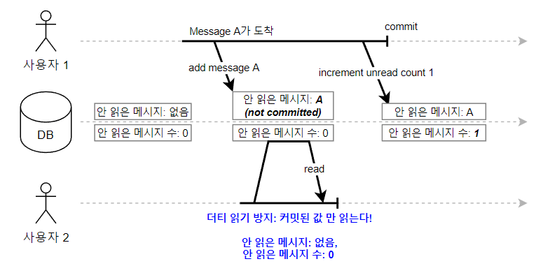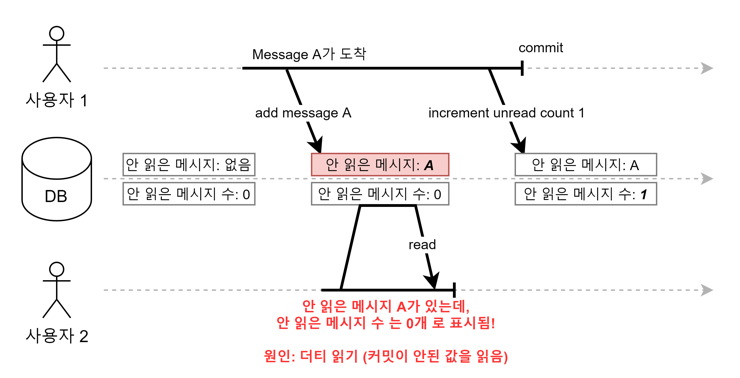 사용자1이 안 읽은 메세지 추가와 안 읽은 메세지 수+1 하는 트랜잭션을 진행하고 있었다. 사용자1이 안 읽은 메세지 추가만 한 상황에서 사용자2가 안 읽은 메세지와 안 읽은 메세지 수를 읽게 되었다. 그래서 안 읽은 메세지는 있는데, 메세지 수는 올라가지 않은 잘 못된 데이터를 얻게 되는 문제가 발생했다.