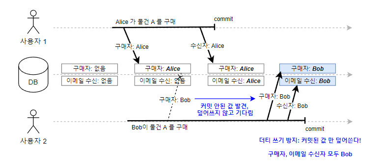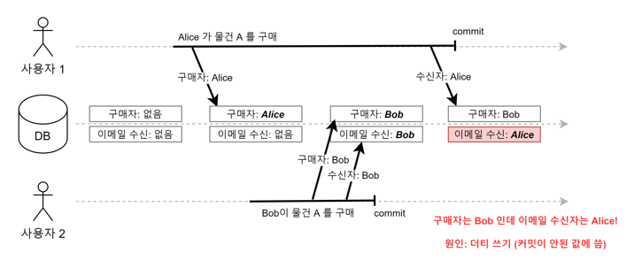 구매자와 이메일 수신자 작성(트랜잭션)이 완전히 커밋 된 데이터만 다른 트랜잭션이 작성할 수 있다