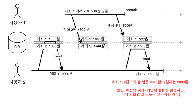 사용자2는 커밋이 완료된 데이터만 읽었음에도, 총합이 2500원(실제는 2000원)이라는 잘못된 데이터를 읽게 되었다.