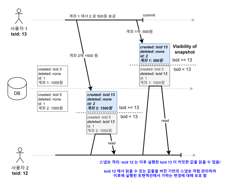 사용자 2의 txid는 12이고 사용자 1의 txid는 13이다. 사용자 2의 트랜잭션이 사용자 1보다 먼저 실행되었다. 스냅숏 격리로 사용자 2는 자신의 트랜잭션을 시작한 시점의 데이터를 사진처럼 가지고 있다. 그래서 사용자 1의 commit은 사용자가 가지고 있는 데이터에 영향을 미치지 못한다. txid-12의 계좌1에 1000원 계좌 2 1000원이라는 데이터는 사용자2가 커밋하기 이전까지는 사용자 2에게 절대 변하지 않는 데이터로 유지되는 것이다.