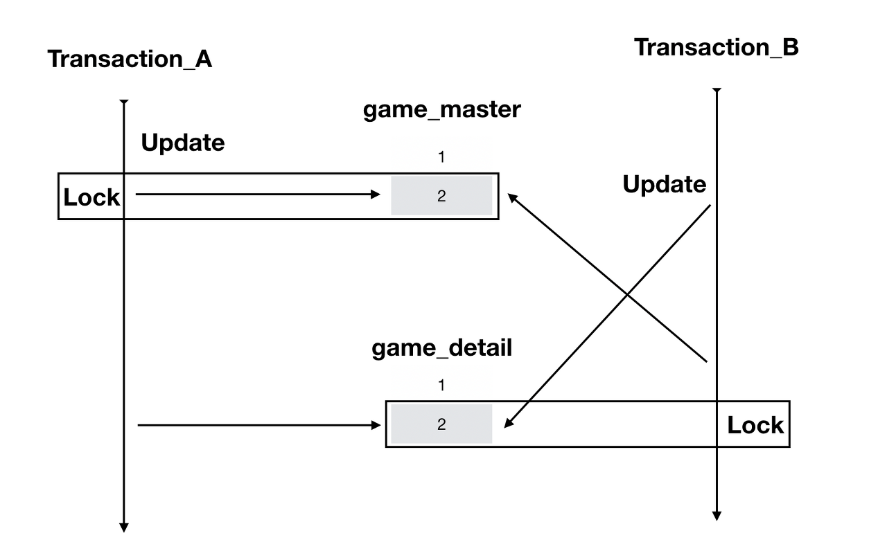 - 데이터 접근 순서를 세우기. 위 예제라면, game_master를 업데이트 한 후 game_detail을 업데이트 한다와 같은 규칙을 정해 테이블 접근의 교차가 일어나지 않도록 한다.