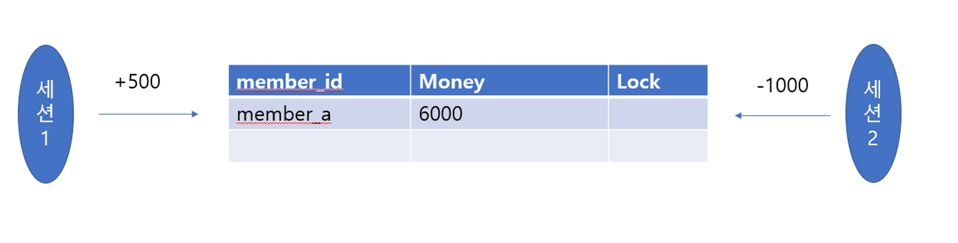 (상황: member_a의 돈에 세션1은 +500을 하게 되고, 세션2는 -1000을 하려고 한다. 그렇다면 결과적으로 money가 5500이 되어야 한다.)