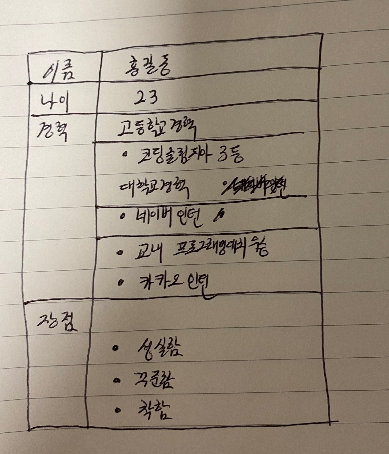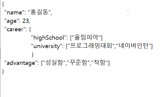 {"name": "홍길동","age": 23,"career": {"highSchool": ["올림피아"]"university": ["프로그래밍대회","네이버인턴"]}"advantage": ["성실함","꾸준함","착함"]}